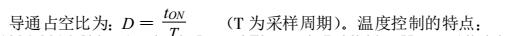 (1)液體本身及加熱器具有很大的熱慣性, 如果追求快速加熱而采用較大的占空比 , 則一旦加熱停止 ,溫度仍繼續(xù)上升 ,由于沒(méi)有冷卻措施 ,此時(shí)溫度失控 ,只能靠自然冷卻。