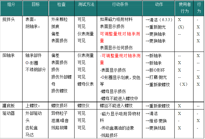 以下檢查應該作為日常維護進行,(每6個月)保證沒有攪拌系統操作問題。有腐蝕性的或高固體含量的產品可能更快地磨壞軸承。